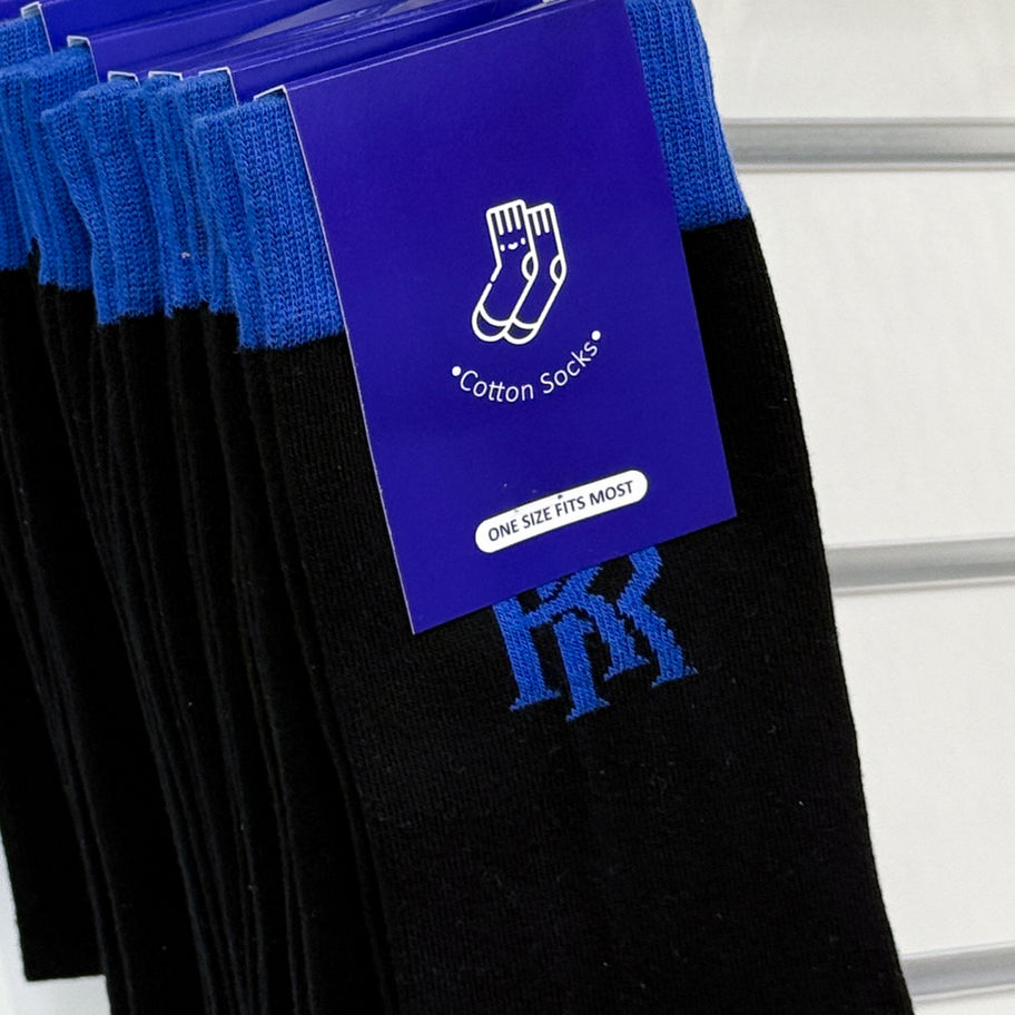 Comfortable black crew socks with blue detailing. Branded with the Rolls-Royce monogram logo.